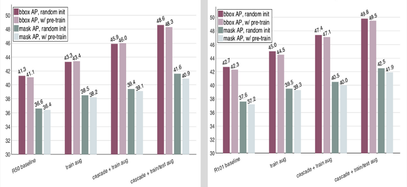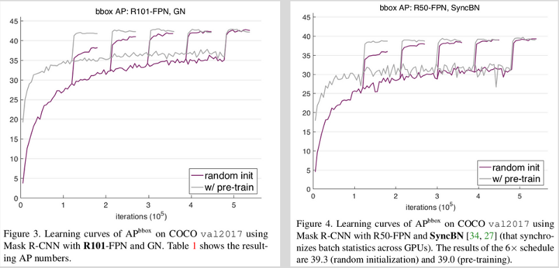 When working with only 1/3rd of the whole COCO training data, i.e. close to 35K images, experiments show that the fine-tune approach starts overfitting after some iterations. That shows that ImageNet pre-training doesn’t automatically help reduce overfitting. But despite less data, training from scratch still catches up with fine-tuned results.