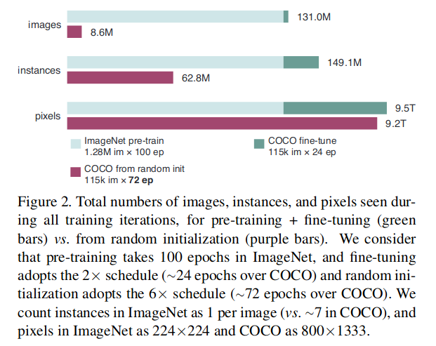 The image here summarizes the number of training samples seen in both cases—with and without pre-training. Depending on the target task, the samples can be images, instances, or pixels. For a segmentation task, the model works at the pixel level. For object detection what matters is the instances of objects in each image. We see that except in segmentation (pixel-level task), training from scratch takes a substantially lower number of training images.