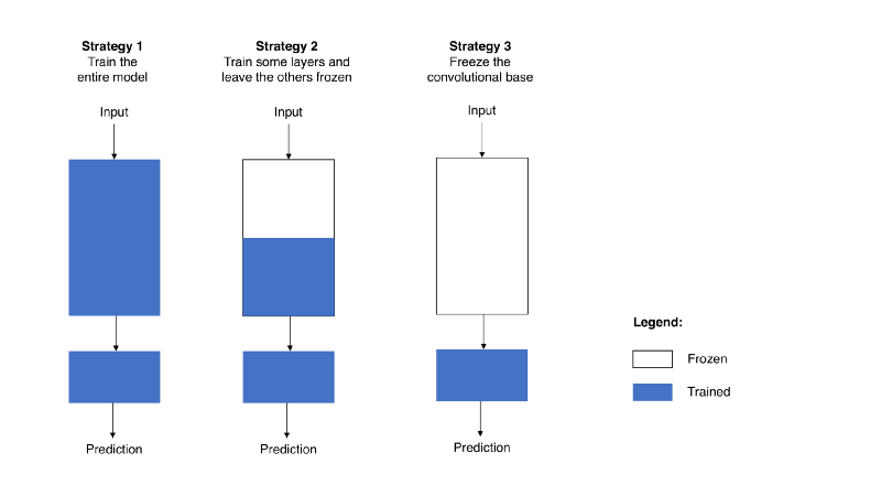 The above image helps visualize a few possibilities when training a model. The image on the right represents a model in which the convolution base of a trained model is frozen and the bottleneck features obtained from it are used to retrain the further layers. This is a typical scenario with pre-trained models. The image in the middle represents a model where, except for the few initial layers, the rest of the network is trained. And the final model on the left represents training a model from scratch—that’s the method we’ll be looking into in this blog.
